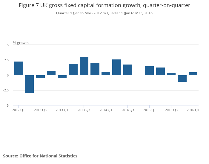 Business investment was estimated to have fallen by 0.5% in Quarter 1 2016 and decreased by 0.4% between Quarter 1 2015 and Quarter 1 2016. Annually, business investment increased by 5.2% between 2014 and 2015.