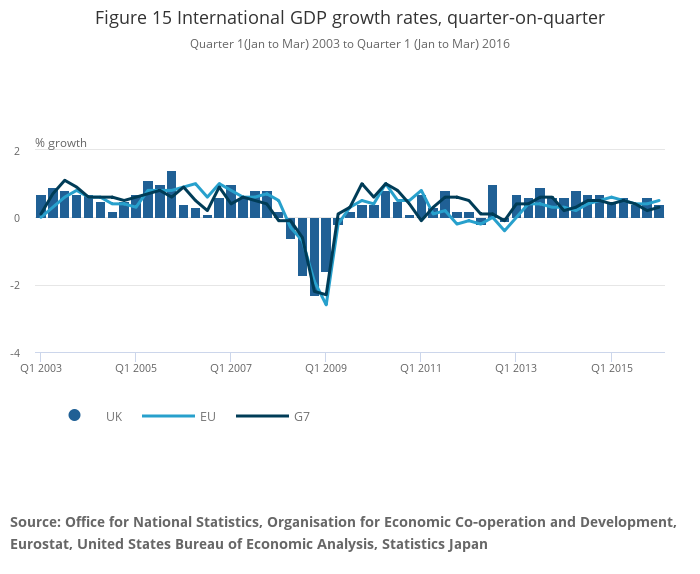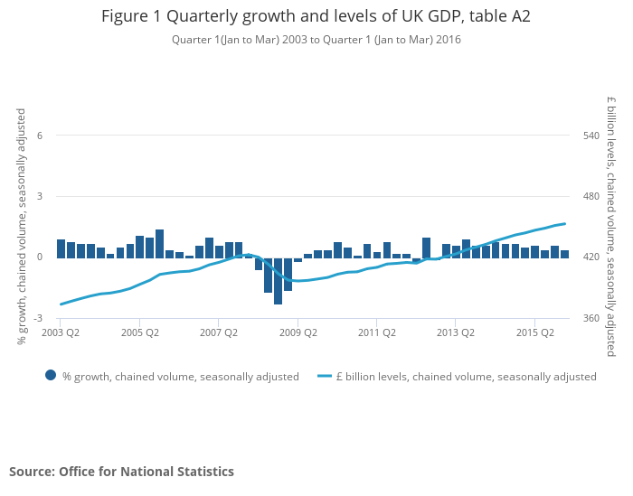 UK GDP in volume terms was estimated to have increased by 0.4% between Quarter 4 (Oct to Dec) 2015 and Quarter 1 (Jan to Mar) 2016, unrevised from the preliminary estimate of GDP published on 27 April 2016. This is the 13th consecutive quarter of positive growth since Quarter 1 2013.