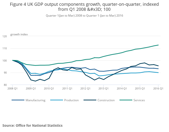 Production activity began to grow again in 2010, and the manufacturing and the construction industries showed particular strength – neither industry sustained this growth. Production output fell between 2011 and 2013, falling below levels seen at the height of the downturn in 2009. Construction output also fell sharply in 2012, but started growing again in 2013. Construction output in 2015 as a whole was 3.4% higher than 2014. This marks a deceleration of growth from 7.5% seen in 2014. In Quarter 1 2016 construction output contracted by 1.0% on a quarter on quarter basis, and by 1.8% on a quarter a year ago basis. Although there has been growth across all major components of GDP since 2013, the service industries remain the largest and steadiest contributor to overall economic growth, and are the only headline industry in which output has exceeded pre-downturn levels.
