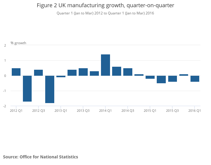 Production output decreased by 0.4% in Quarter 1 2016 compared with Quarter 4 2015, unrevised from the previously published estimate. Within the production sub-industries, output from mining and quarrying, including oil and gas extraction, decreased by 2.3%; manufacturing (the largest component of production) decreased by 0.4% (figure 2), while the electricity, gas, steam and air conditioning supply industries increased by 0.4%. Water supply and sewerage increased by 2.3%.