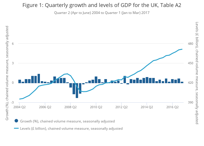 .xls (29.7 kB)As seen in Figure 1, between Quarter 4 (Oct to Dec) 2016 and Quarter 1 (Jan to Mar) 2017, UK gross domestic product (GDP) grew by 0.2%, which is the 17th consecutive quarterly increase and continues the UK’s period of steady growth since Quarter 1 2013.