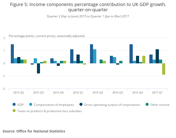 Within the income measure of GDP, three of the four components showed growth between Quarter 4 2016 and Quarter 1 2017. Gross operating surplus of corporations, the profits of companies, showed positive growth of 5.3%.