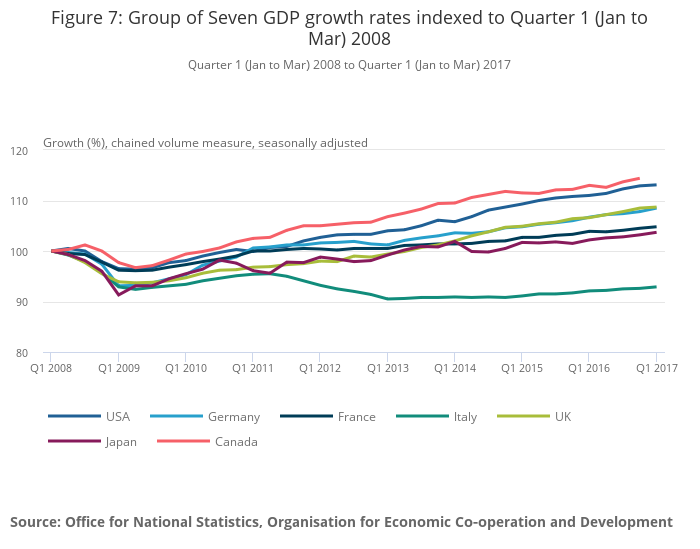 All G7 countries are currently above pre-economic downturn peaks except for Italy whose gross domestic product (GDP) remains 7.1% below the pre-downturn peak (Quarter 1 2008). The USA shows signs of the strongest recovery at 13.1%. The UK has the second strongest rate at 8.7%, whilst Germany and France have rates of 8.5% and 4.8% respectively.