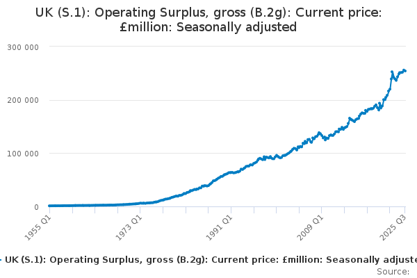 Download this time seriesUK (S.1): Operating Surplus, gross (B.2g): Current price: £million: Seasonally adjusted