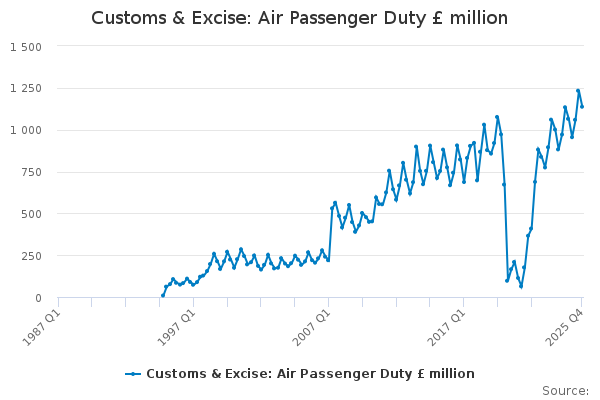 Download this time seriesCustoms & Excise: Air Passenger Duty £ million