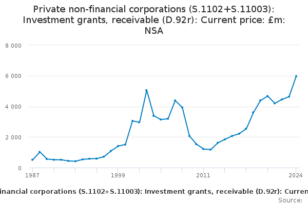 Download this time seriesPrivate non-financial corporations (S.1102+S.11003): Investment grants, receivable (D.92r): Current price: £m: NSA