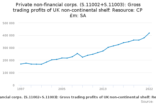 Download this time seriesPrivate non-financial corps. (S.11002+S.11003): Gross trading profits of UK non-continental shelf: Resource: CP £m: SA