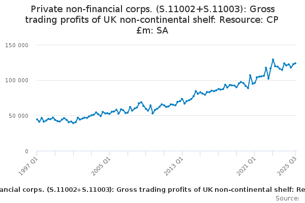 Download this time seriesPrivate non-financial corps. (S.11002+S.11003): Gross trading profits of UK non-continental shelf: Resource: CP £m: SA