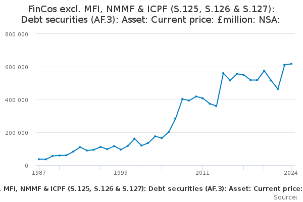 Download this time seriesFinCos excl. MFI, NMMF & ICPF (S.125, S.126 & S.127): Debt securities (AF.3): Asset: Current price: £million: NSA: