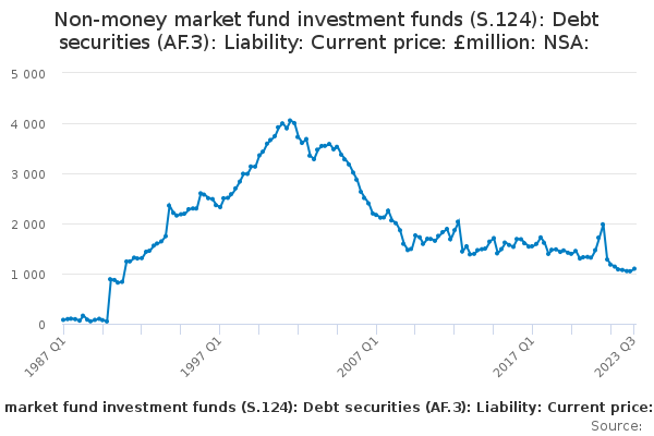 Download this time seriesNon-money market fund investment funds (S.124): Debt securities (AF.3): Liability: Current price: £million: NSA: