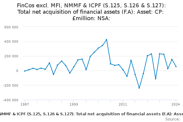 Download this time seriesFinCos excl. MFI, NMMF & ICPF (S.125, S.126 & S.127): Total net acquisition of financial assets (F.A): Asset: CP: £million: NSA: