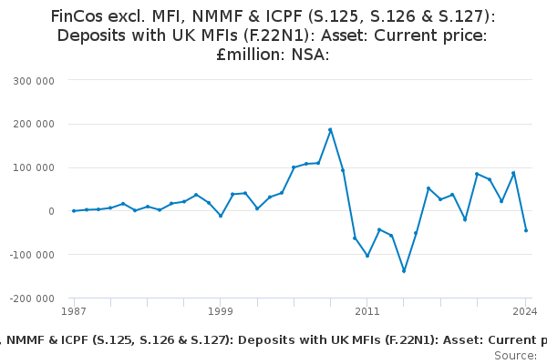 Download this time seriesFinCos excl. MFI, NMMF & ICPF (S.125, S.126 & S.127): Deposits with UK MFIs (F.22N1): Asset: Current price: £million: NSA: