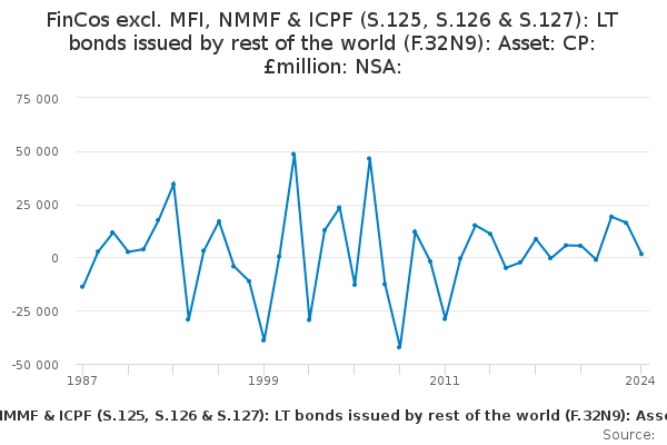 Download this time seriesFinCos excl. MFI, NMMF & ICPF (S.125, S.126 & S.127): LT bonds issued by rest of the world (F.32N9): Asset: CP: £million: NSA: