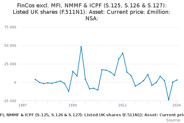 Download this time seriesFinCos excl. MFI, NMMF & ICPF (S.125, S.126 & S.127): Listed UK shares (F.511N1): Asset: Current price: £million: NSA: