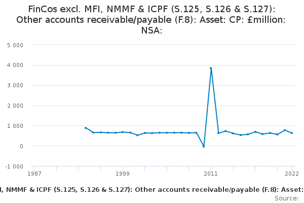 Download this time seriesFinCos excl. MFI, NMMF & ICPF (S.125, S.126 & S.127): Other accounts receivable/payable (F.8): Asset: CP: £million: NSA: