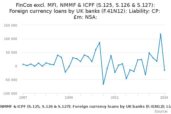 Download this time seriesFinCos excl. MFI, NMMF & ICPF (S.125, S.126 & S.127): Foreign currency loans by UK banks (F.41N12): Liability: CP: £m: NSA: