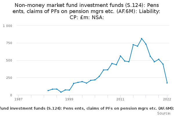 Download this time seriesNon-money market fund investment funds (S.124): Pens ents, claims of PFs on pension mgrs etc. (AF.6M): Liability: CP: £m: NSA: