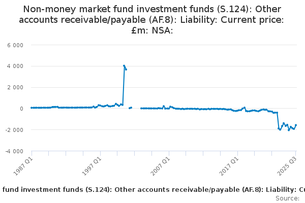 Download this time seriesNon-money market fund investment funds (S.124): Other accounts receivable/payable (AF.8): Liability: Current price: £m: NSA: