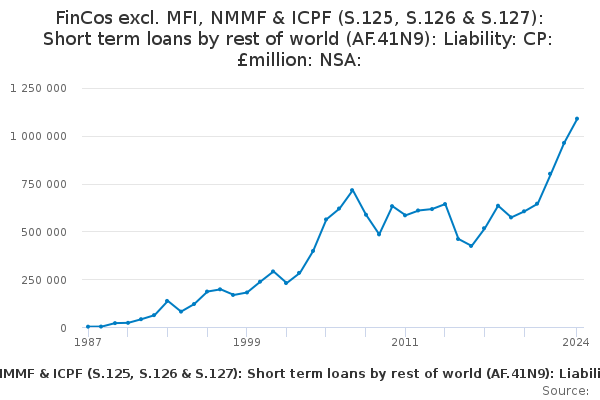 Download this time seriesFinCos excl. MFI, NMMF & ICPF (S.125, S.126 & S.127): Short term loans by rest of world (AF.41N9): Liability: CP: £million: NSA: