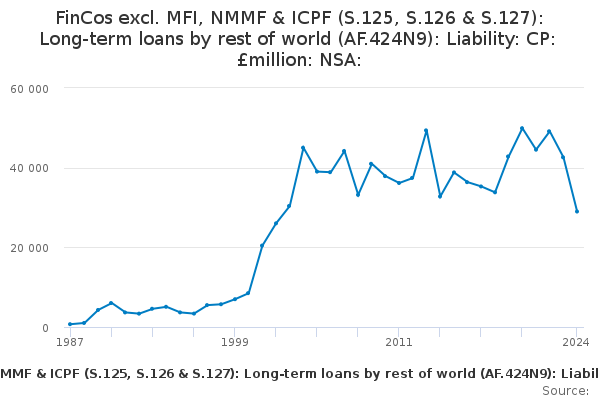 Download this time seriesFinCos excl. MFI, NMMF & ICPF (S.125, S.126 & S.127): Long-term loans by rest of world (AF.424N9): Liability: CP: £million: NSA: