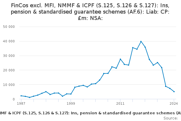 Download this time seriesFinCos excl. MFI, NMMF & ICPF (S.125, S.126 & S.127): Ins, pension & standardised guarantee schemes (AF.6): Liab: CP: £m: NSA: