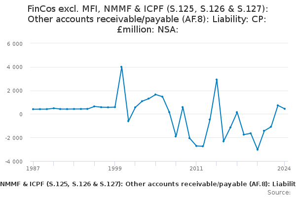 Download this time seriesFinCos excl. MFI, NMMF & ICPF (S.125, S.126 & S.127): Other accounts receivable/payable (AF.8): Liability: CP: £million: NSA: