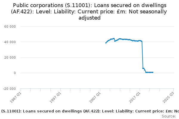 Download this time seriesPublic corporations (S.11001): Loans secured on dwellings (AF.422): Level: Liability: Current price: £m: Not seasonally adjusted