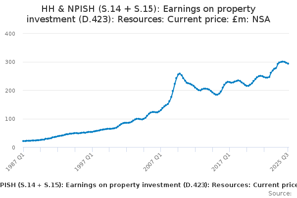 Download this time seriesHH & NPISH (S.14 + S.15): Earnings on property investment (D.423): Resources: Current price: £m: NSA