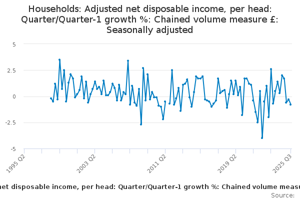 Download this time seriesHouseholds: Adjusted net disposable income, per head: Quarter/Quarter-1 growth %: Chained volume measure £: Seasonally adjusted