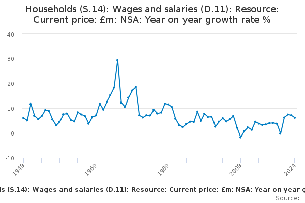 Download this time seriesHouseholds (S.14): Wages and salaries (D.11): Resource: Current price: £m: NSA: Year on year growth rate %