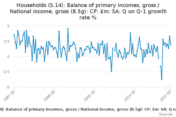 Download this time seriesHouseholds (S.14): Balance of primary incomes, gross / National income, gross (B.5g): CP: £m: SA: Q on Q-1 growth rate %
