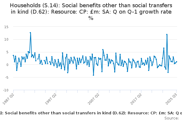 Download this time seriesHouseholds (S.14): Social benefits other than social transfers in kind (D.62): Resource: CP: £m: SA: Q on Q-1 growth rate %