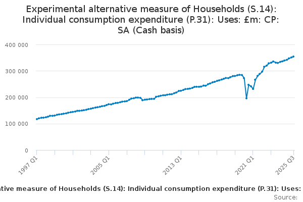 Download this time seriesExperimental alternative measure of Households (S.14): Individual consumption expenditure (P.31): Uses: £m: CP: SA (Cash basis)