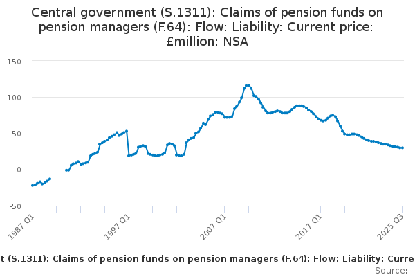 Download this time seriesCentral government (S.1311): Claims of pension funds on pension managers (F.64): Flow: Liability: Current price: £million: NSA