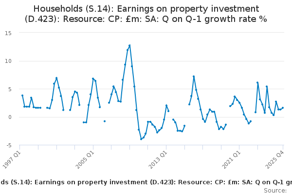 Download this time seriesHouseholds (S.14): Earnings on property investment (D.423): Resource: CP: £m: SA: Q on Q-1 growth rate %