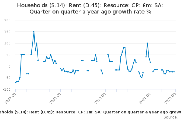 Download this time seriesHouseholds (S.14): Rent (D.45): Resource: CP: £m: SA: Quarter on quarter a year ago growth rate %