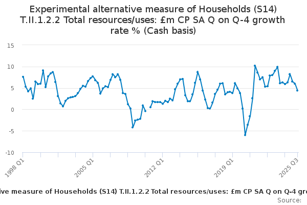 Download this time seriesExperimental alternative measure of Households (S14) T.II.1.2.2 Total resources/uses: £m CP SA Q on Q-4 growth rate % (Cash basis)