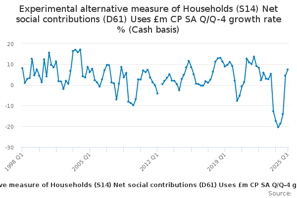 Download this time seriesExperimental alternative measure of Households (S14) Net social contributions (D61) Uses £m CP SA Q/Q-4 growth rate % (Cash basis)
