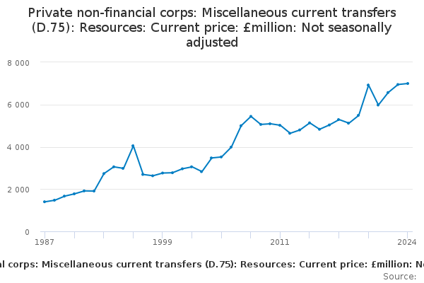 Download this time seriesPrivate non-financial corps: Miscellaneous current transfers (D.75): Resources: Current price: £million: Not seasonally adjusted