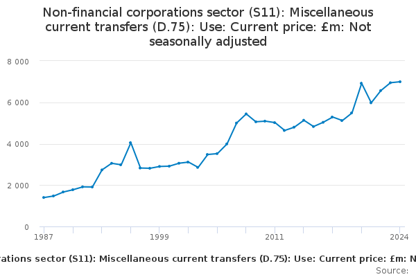 Download this time seriesNon-financial corporations sector (S11): Miscellaneous current transfers (D.75): Use: Current price: £m: Not seasonally adjusted