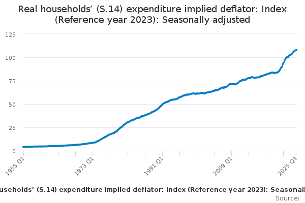 CRXB – Real households and non-profit institutions serving households (S.14 + S.15) expenditure implied deflator: Index (Reference year 2016): Not seasonally adjusted YBFS – Real households and non-profit institutions serving households (S.14 + S.15) expenditure implied deflator: Index (Reference year 2016): Seasonally adjusted CRXA – Real households (S.14) expenditure implied deflator: Index (Reference year 2016): Not seasonally adjusted DG2Q – Real households (S.14) expenditure implied deflator: Index (Reference year 2016): Seasonally adjusted CSC8 - Real households (S.14) expenditure implied deflator: Y/Y-1 growth percent: Seasonally adjusted CSEZ - Real households (S.14) expenditure implied deflator: Q/Q-1 growth percent: Seasonally adjusted CSGE - Real households (S.14) expenditure implied deflator: Q/Q-4 percent: Seasonally adjusted CSK9 – Cash Basis Real Households (S.14) Expenditure implied deflator: Index (ref year = 2016): Seasonally adjusted CSJ6 - CASH BASIS Real Households (S.14) disposable income: £Million: Seasonally adjusted CSJ7 – CASH BASIS Real Households (S.14) disposable income: growth t/t-1 percent: Seasonally adjusted CSK4 – CASH BASIS Real Households (S.14) disposable income: growth t/t-4 percent: Seasonally adjusted CSK2 – CASH BASIS Real households (S.14) disposable income: Per head £: SA Seasonally adjusted CSK3 – CASH BASIS Real households (S.14) disposable income: Per head growth t/t-1 percent: Seasonally adjusted CT3K – CASH BASIS Real households (S.14) disposable income: Per head growth t/t-1 percent: Seasonally adjusted