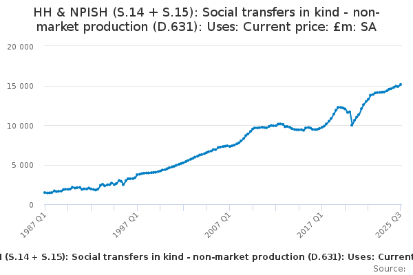 Download this time seriesHH & NPISH (S.14 + S.15): Social transfers in kind - non-market production (D.631): Uses: Current price: £m: SA