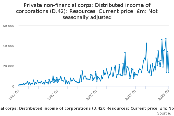 Download this time seriesPrivate non-financial corps: Distributed income of corporations (D.42): Resources: Current price: £m: Not seasonally adjusted