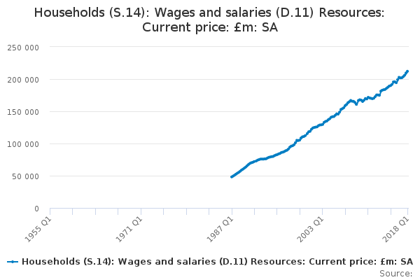 Download this time seriesHouseholds (S.14): Wages and salaries (D.11) Resources: Current price: £m: SA