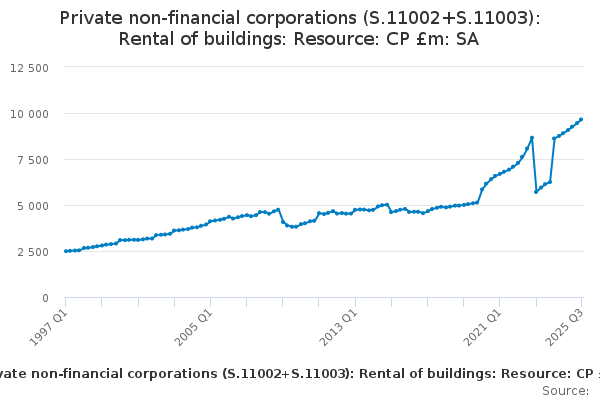 Download this time seriesPrivate non-financial corporations (S.11002+S.11003): Rental of buildings: Resource: CP £m: SA