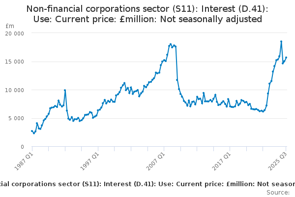 Download this time seriesNon-financial corporations sector (S11): Interest (D.41): Use: Current price: £million: Not seasonally adjusted