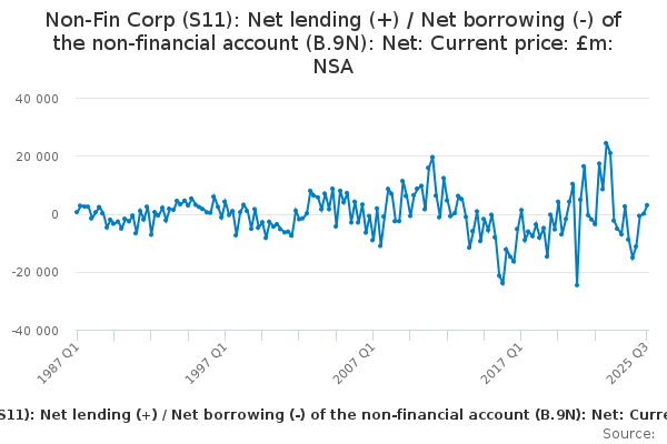 Download this time seriesNon-Fin Corp (S11): Net lending (+) / Net borrowing (-) of the non-financial account (B.9N): Net: Current price: £m: NSA