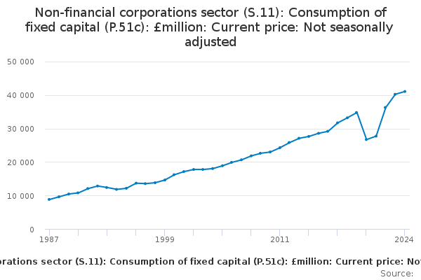 Download this time seriesNon-financial corporations sector (S.11): Consumption of fixed capital (P.51c): £million: Current price: Not seasonally adjusted
