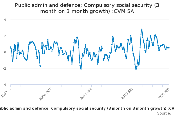 Download this time seriesPublic admin and defence; Compulsory social security (3 month on 3 month growth) :CVM SA