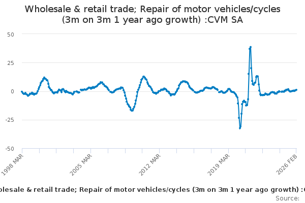 Download this time seriesWholesale & retail trade; Repair of motor vehicles/cycles (3m on 3m 1 year ago growth) :CVM SA